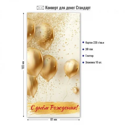 Конверт для денег ДР «С Днем рождения!», золотые шарики, уф-лак, блестки