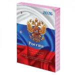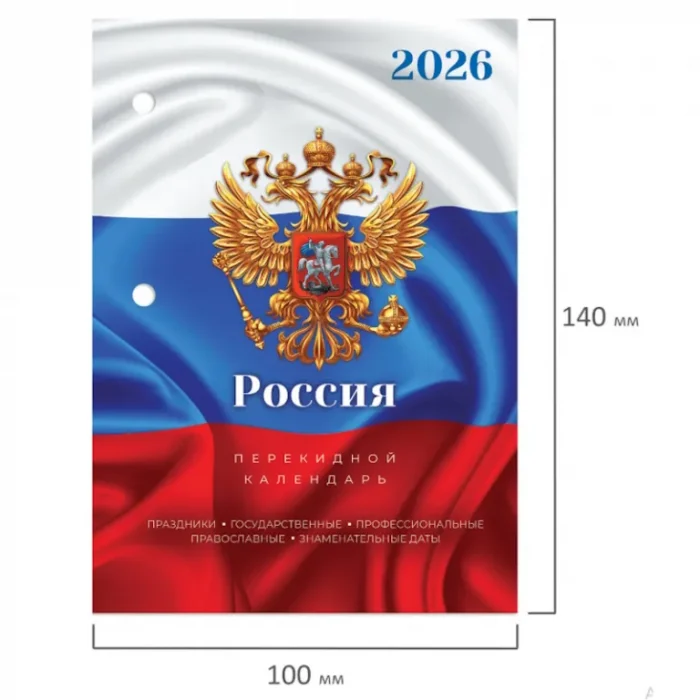 Блок календаря на 2026 год напечатан на офсетной бумаге плотностью 60 г/м2 в две краски с выделением цветом выходных и праздничных дней.