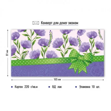 Конверты для денег стандарт формата 164×81 мм, материал: картон плотностью 210 г/кв.м. Обработка: УФ-лак, глиттер. Упакованы по 10 штук одного вида.