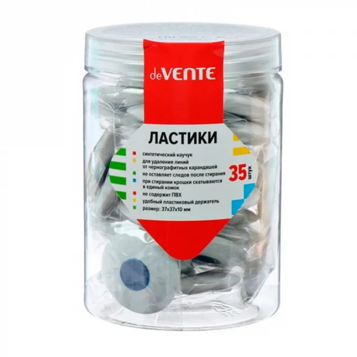 Ластик «deVENTE. Core» синтетический каучук, круглый белый, 37x37x10 мм, dust-free, с пластиковым держателем, в индивидуальной упаковке с штрих кодом, в пластиковой банке