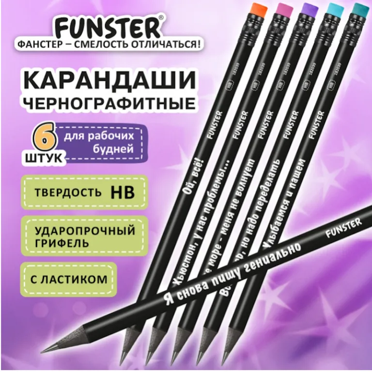 Устали от скучных канцтоваров? Карандаши чернографитные FUNSTER FUNNY NOTES не просто оставляют след на бумаге – они поднимают настроение!