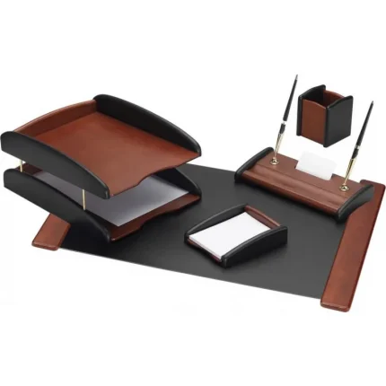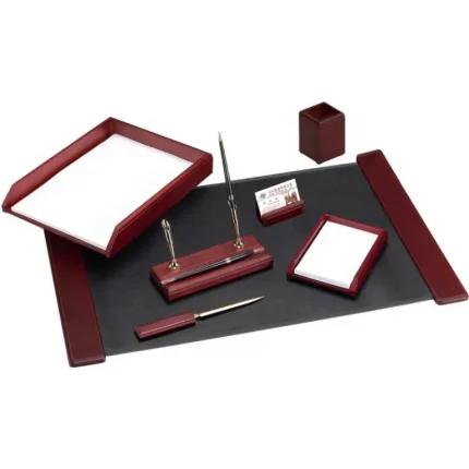 Состав набора: Подставка для ручек с 2 ручками, подставка для записок, подставка для визиток, нож для бумаг, подставка для пишущих принадлежностей, лоток для бумаг с двумя отделениями