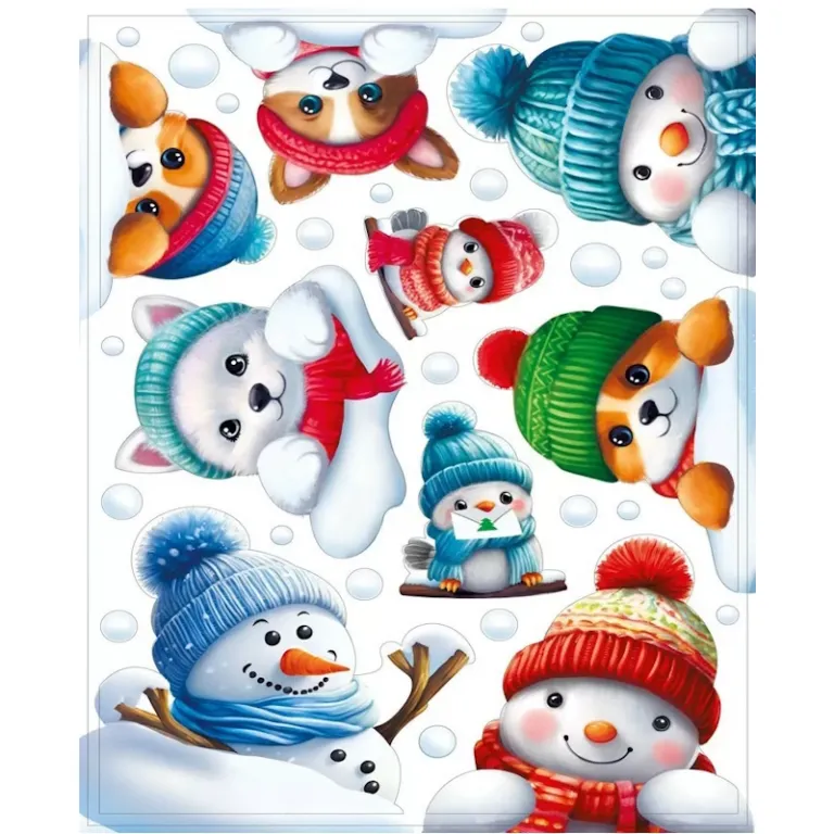 Оформительские двусторонние наклейки с милыми зимними персонажами — это идеальный выбор для создания праздничной атмосферы в доме или офисе, в детском саду или школе.