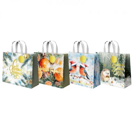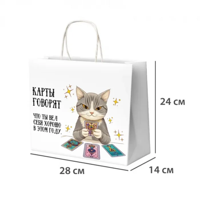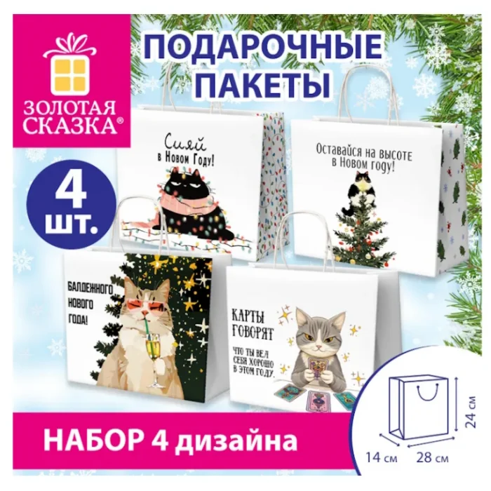 Размер – 28х14х24 см. На пакетах изображены забавные иллюстрации котиков в новогодней тематике и смешные надписи, которые точно вызовут улыбку.