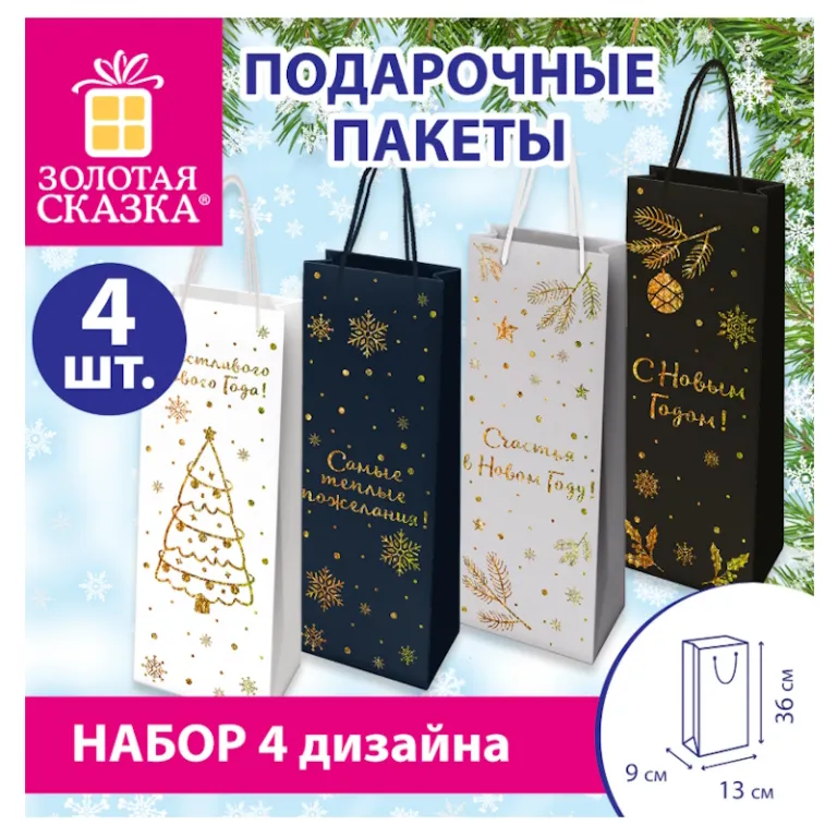 Подарочный новогодний пакет (набор из 4 штук) «Bottle #2» ЗОЛОТАЯ СКАЗКА – отличное решение для упаковки любого презента, которое позволит легко и со вкусом оформить выбранный подарок.