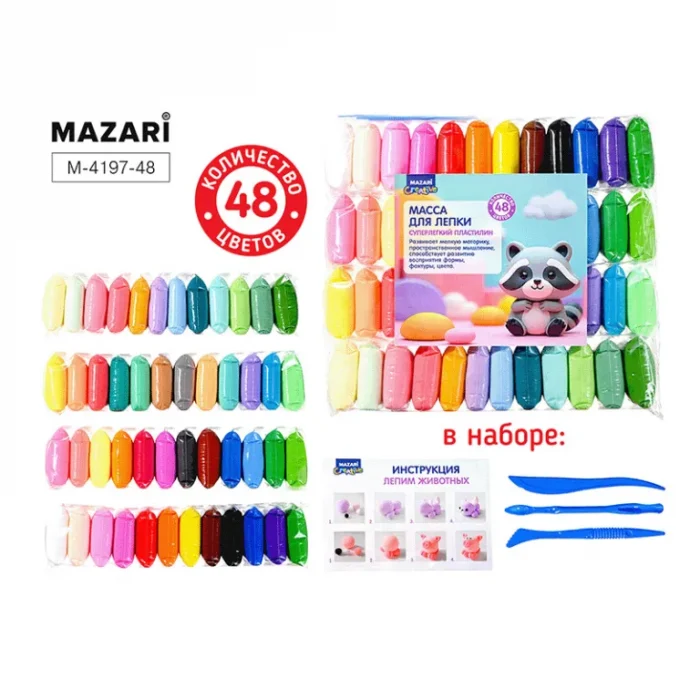 Пластилин супер легкий 48 цв., 576 г, 3 стека, пакет, Mazari