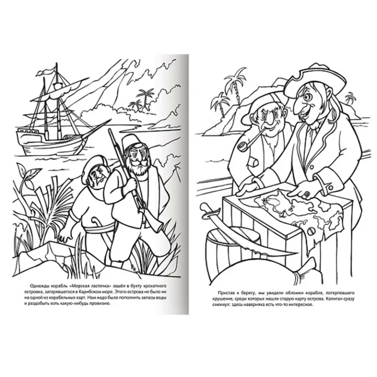 Отважные сорвиголовы, охотники за сокровищами, гроза Карибского моря! Часто ли улыбалась им удача? Ответ ждёт вас в книжках-раскрасках серии Пираты.