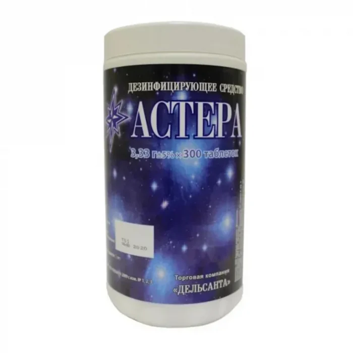 Дезинфицирующее средство «АСТЕРА» в виде таблеток предназначено для дезинфекции поверхностей в помещениях, жесткой мебели, санитарно-технического оборудования, белья, посуды (в том числе одноразовой и лабораторной),